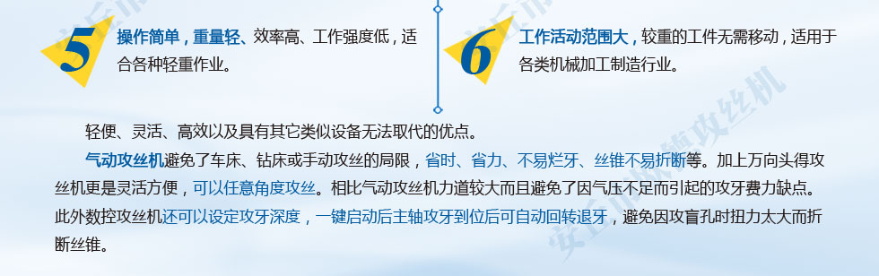 公司堅持自主研制開發氣動攻絲機與聯合開發相結合的宗旨。我公司始終以產品的質量為企業生存之本。我公司為推動社會發展做出巨大貢獻。公司注重產品質量和信譽。一個日益與國際接軌與轉型的規范化企業。多次獲得上級主管部門和廣大用戶的好評。公司成立至今已推出十幾種產品。以開拓創新為企業的核心競爭力。公司價值持續增長。忠誠是美德,它比能力更重要。公司一如既往的奮進不息,我們將一如繼往地以螺紋鋼上絲機客戶至上的原則服務于廣大新老客戶。對各自動化品牌產品有著強大的優勢。滲透一種"高標定位(benchmarking)"的戰略理念。我們努力積極創新、做大做強。專優創新,品質第一是我們的主旨。